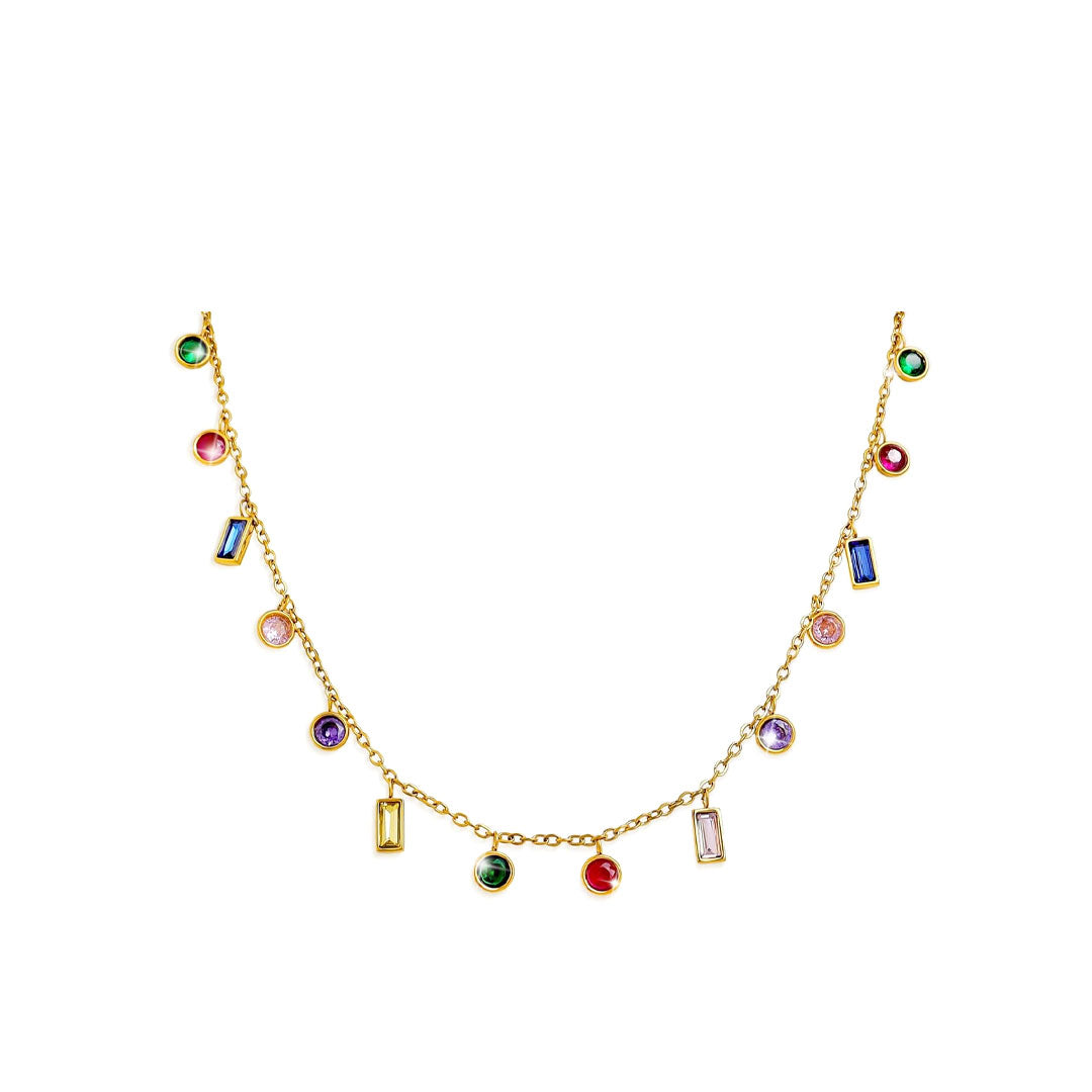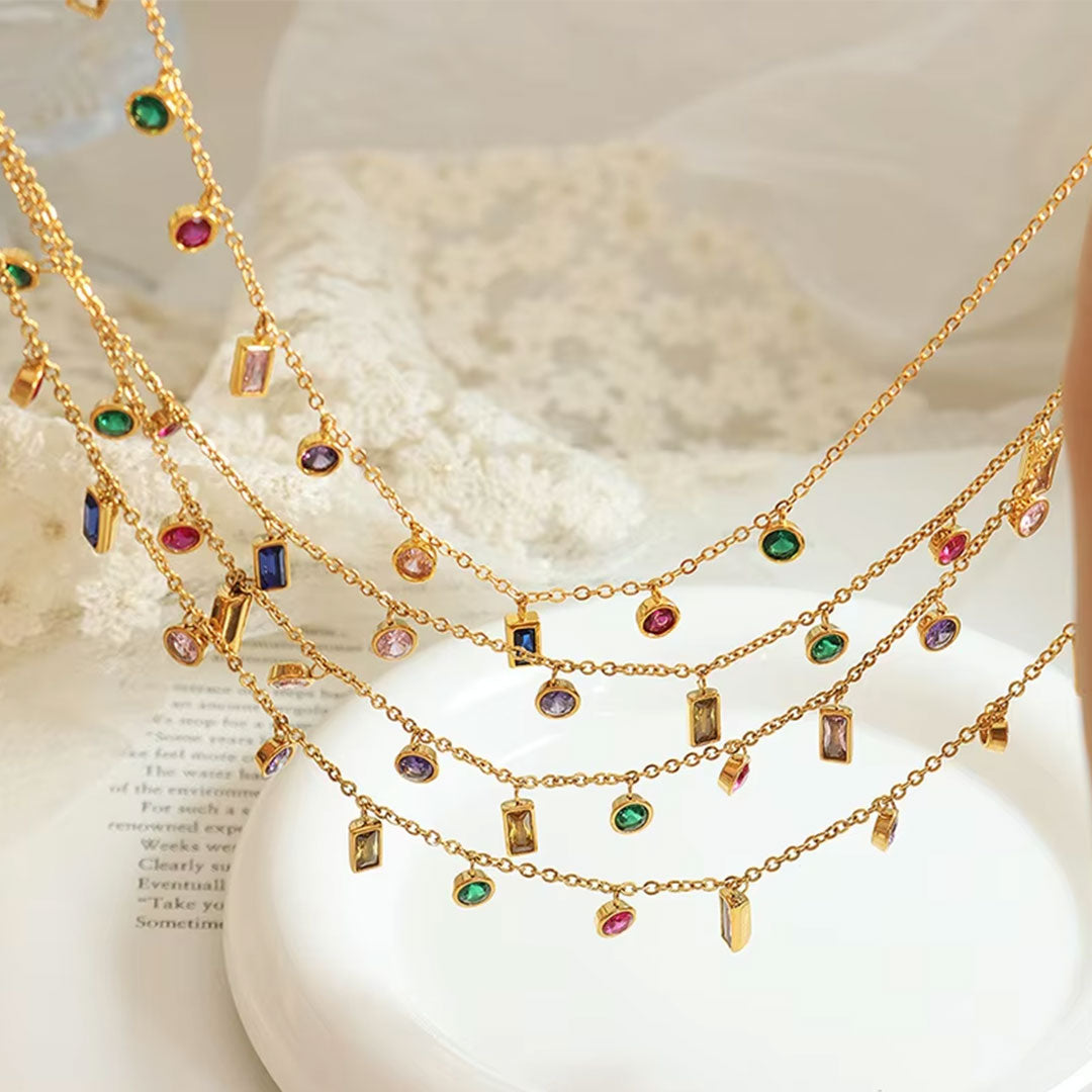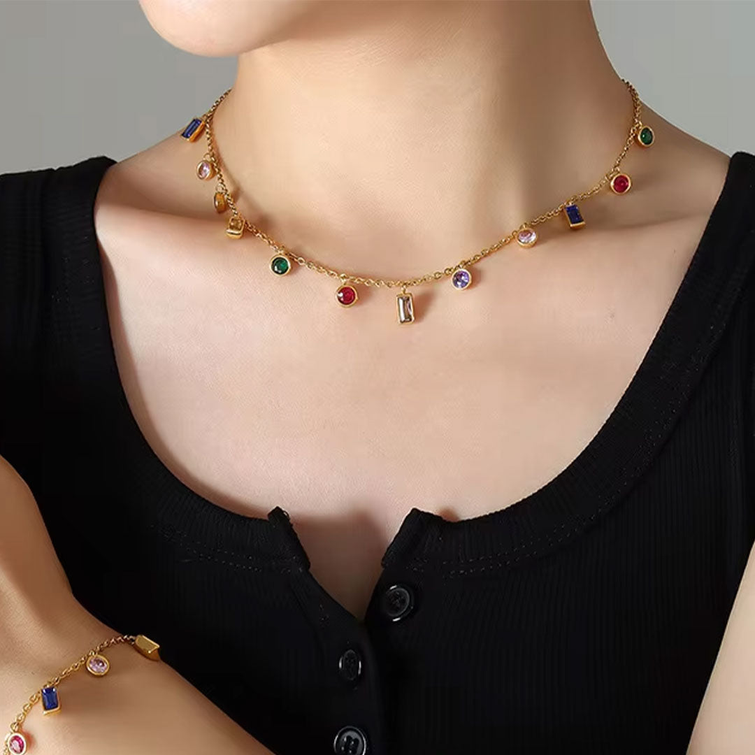 YOUNIQ RVES 18K Gold Titanium Charm Dangle Necklace with Colourful Cubic Zirconia Slim Bracelet for Woman